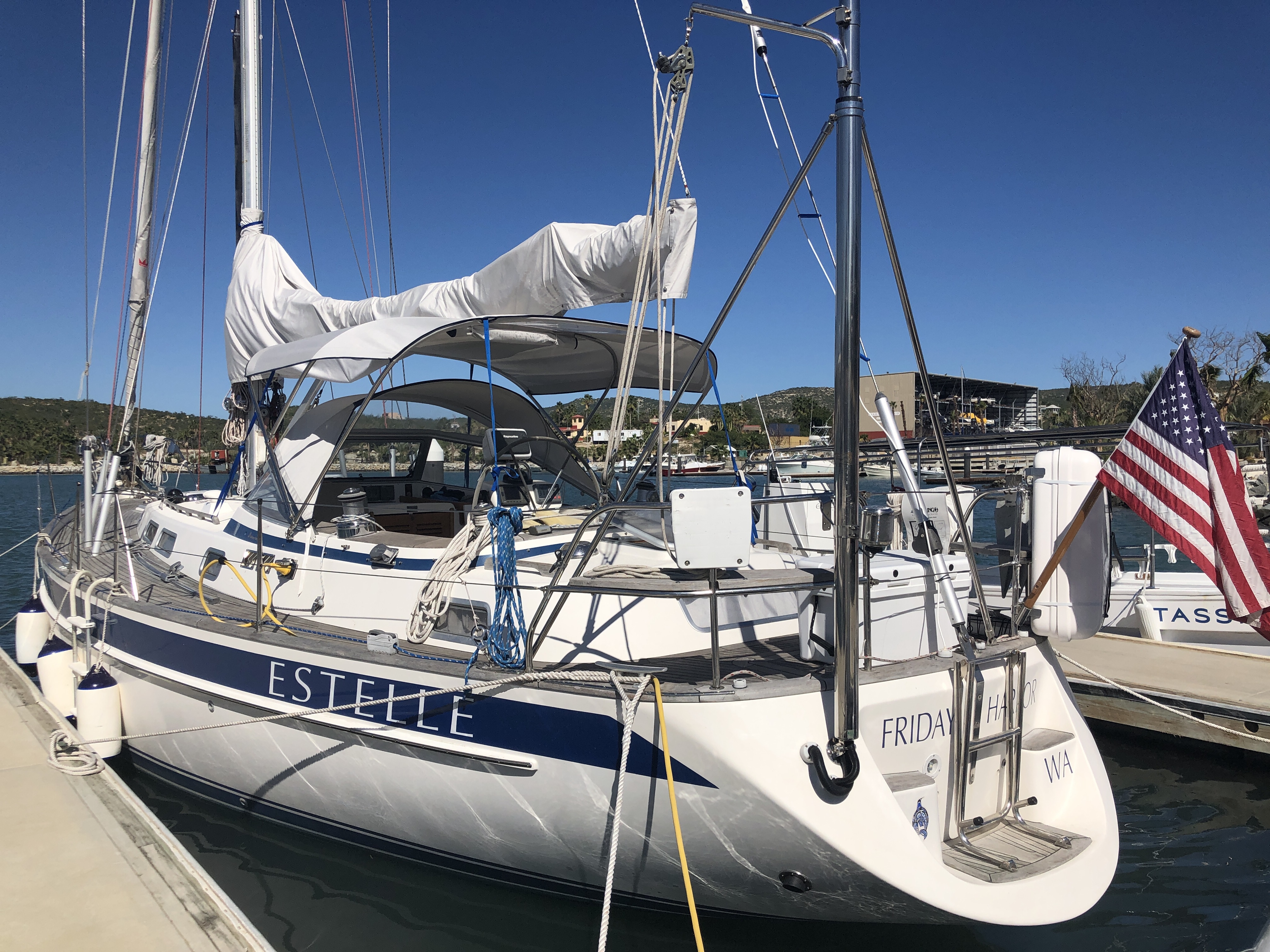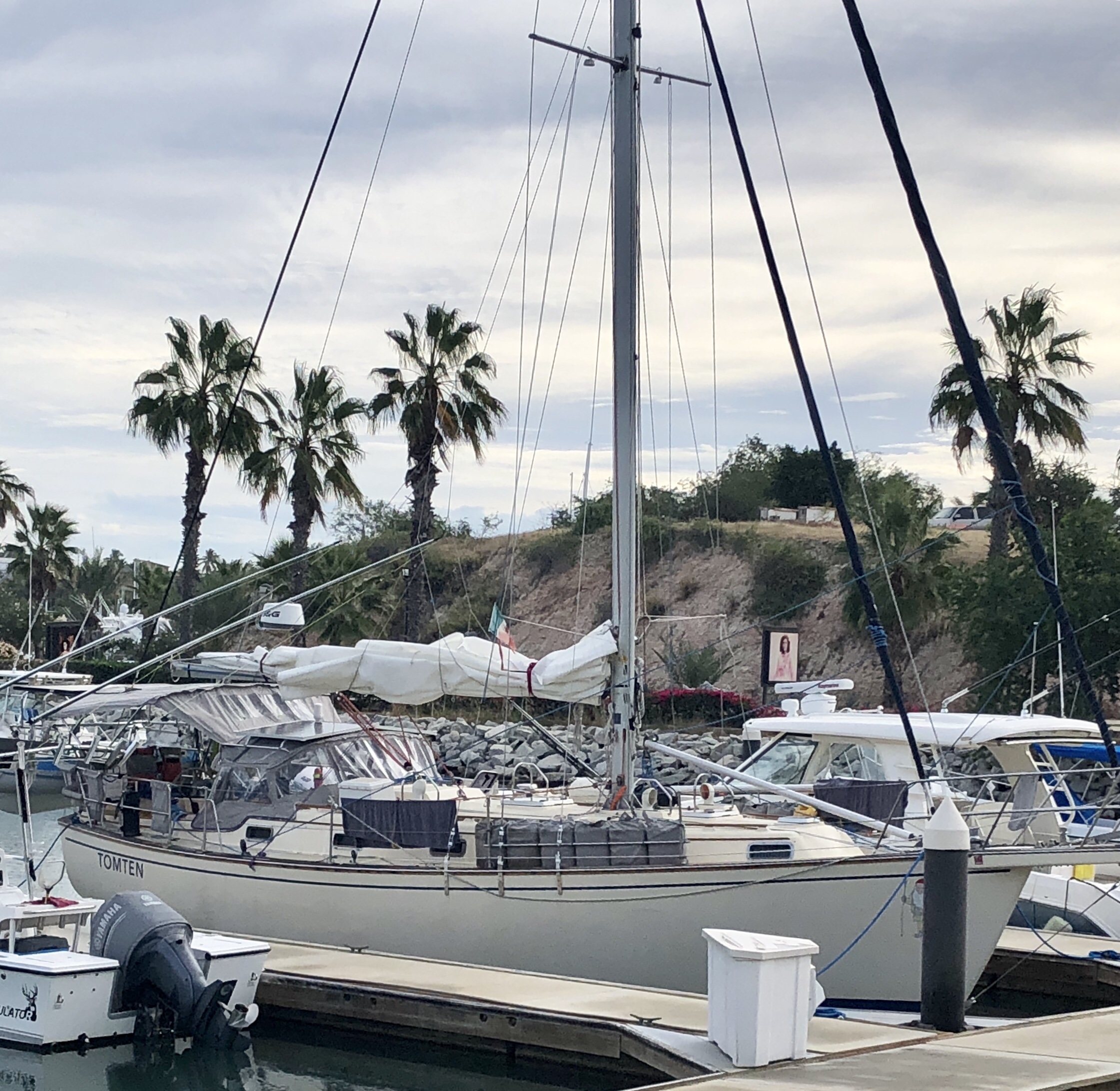Puerto Los Cabos Marina is a peaceful, well protected harbor. Estelle settled gratefully into her new slip there–not a single loudspeaker to disturb the peace. We ended up on the east side of the harbor–which is okay as it is virtually across the street from a convenience store and lavanderia (a load of laundry washed, dried, and folded is 85 pesos–about $4.50 U.S.) but unfortunately only unlighted dirt paths to the very nice showers.
