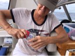 Today we wrote a note. We placed it, a dollar bill, a peso, and Estelle’s calling card in a bottle and tossed it overboard at what we are calling our 1/2 way spot. See action photos! It will be cool if it gets found on a distant shore and contact with us is made. Who knows?