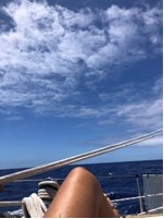 Last night we had a smorgasbord of weather.  Winds from 8 to 34 knots, winds out of the SW, SE, N, a little rain and stars.  When the stars come out its flipping amazing.  I thought stars in the dessert were fab but here with the forever horizon its breathtaking.  It makes one feel very small and grateful. This morning we are back running wing on wing (a sail position) with the trades.